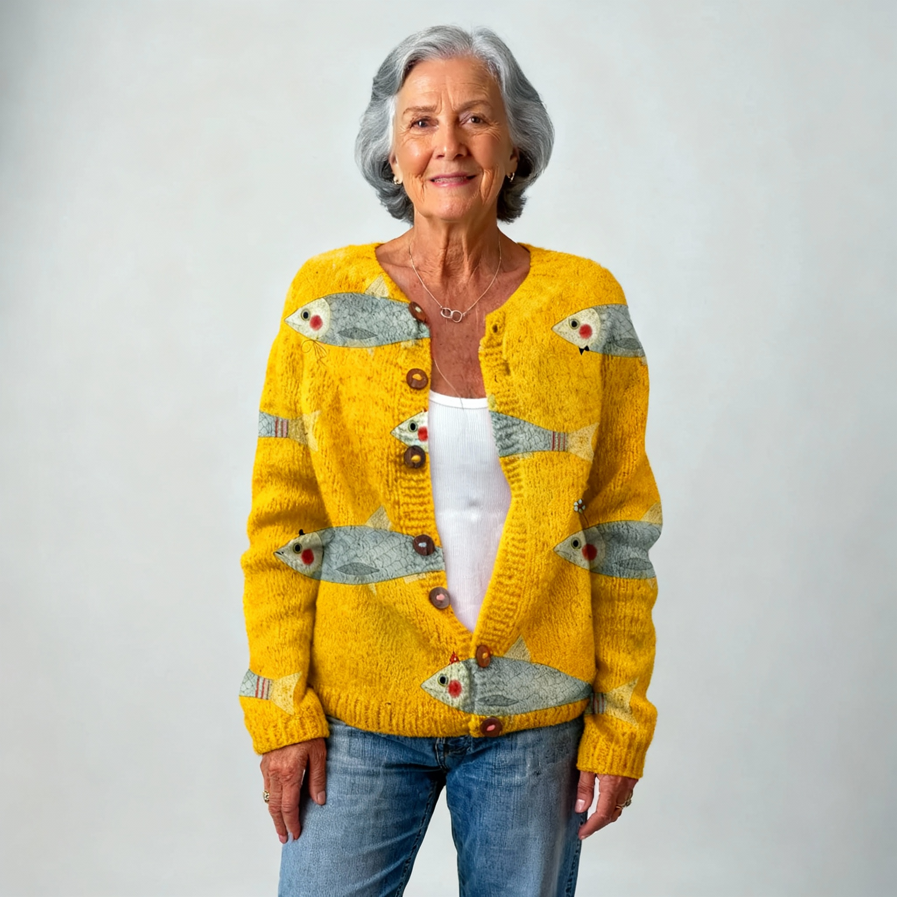 The Bella Cardigan is for women who love style with personality. Its warm golden knit sets the perfect backdrop for charming hand-drawn sardine illustrations, creating a look that’s fun, creative, and beautifully unique.